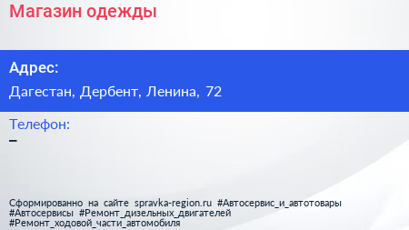 Магазин одежды по адресу Дагестан, Дербент, Ленина, 72 в дальнейшем Организация, размещена в следующих категориях: