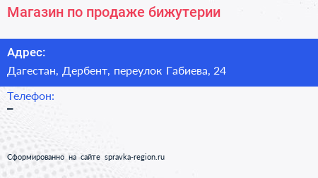 Магазин по продаже бижутерии по адресу Дагестан, Дербент, переулок Габиева, 24 в дальнейшем Организация, размещена в следующих категориях: