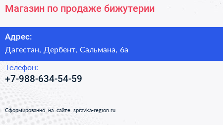 Магазин по продаже бижутерии по адресу Дагестан, Дербент, Сальмана, 6а в дальнейшем Организация, размещена в следующих категориях: