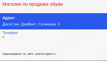 Магазин по продаже обуви по адресу Дагестан, Дербент, Сальмана, 2 в дальнейшем Организация, размещена в следующих категориях: