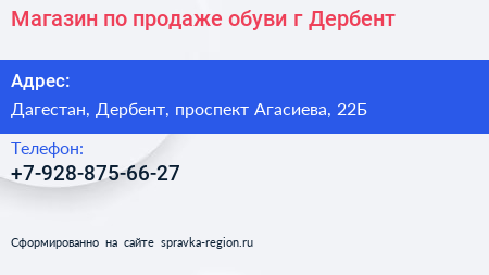 Магазин по продаже обуви, г. Дербент по адресу Дагестан, Дербент, проспект Агасиева, 22Б в дальнейшем Организация, размещена в следующих категориях: