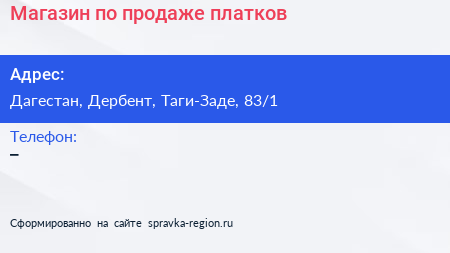 Магазин по продаже платков по адресу Дагестан, Дербент, Таги-Заде, 83/1 в дальнейшем Организация, размещена в следующих категориях: