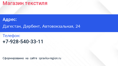 Магазин текстиля по адресу Дагестан, Дербент, Автовокзальная, 24 в дальнейшем Организация, размещена в следующих категориях: