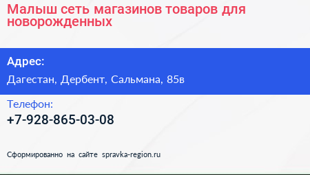 Малыш, сеть магазинов товаров для новорожденных по адресу Дагестан, Дербент, Сальмана, 85в в дальнейшем Организация, размещена в следующих категориях: