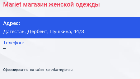 Mariet, магазин женской одежды по адресу Дагестан, Дербент, Пушкина, 44/3 в дальнейшем Организация, размещена в следующих категориях: