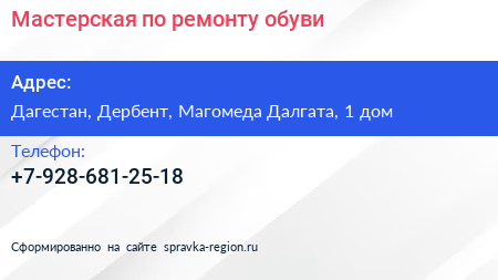 Мастерская по ремонту обуви по адресу Дагестан, Дербент, Магомеда Далгата, 1 дом в дальнейшем Организация, размещена в следующих категориях: