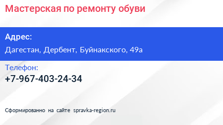 Мастерская по ремонту обуви по адресу Дагестан, Дербент, Буйнакского, 49а в дальнейшем Организация, размещена в следующих категориях: