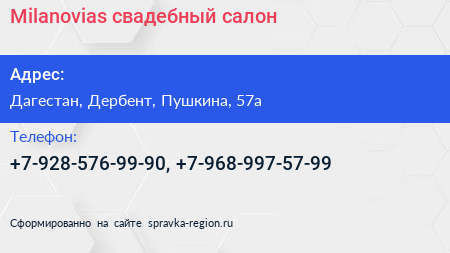 Milanovias, свадебный салон по адресу Дагестан, Дербент, Пушкина, 57а в дальнейшем Организация, размещена в следующих категориях: