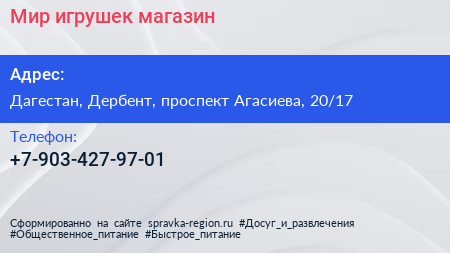 Мир игрушек, магазин по адресу Дагестан, Дербент, проспект Агасиева, 20/17 в дальнейшем Организация, размещена в следующих категориях: