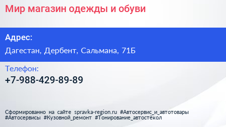 Мир, магазин одежды и обуви по адресу Дагестан, Дербент, Сальмана, 71Б в дальнейшем Организация, размещена в следующих категориях: