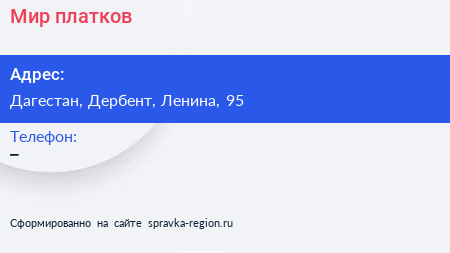 Мир платков по адресу Дагестан, Дербент, Ленина, 95 в дальнейшем Организация, размещена в следующих категориях: