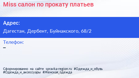Miss, салон по прокату платьев по адресу Дагестан, Дербент, Буйнакского, 68/2 в дальнейшем Организация, размещена в следующих категориях: