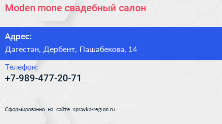 Moden mone, свадебный салон по адресу Дагестан, Дербент, Пашабекова, 14 в дальнейшем Организация, размещена в следующих категориях: