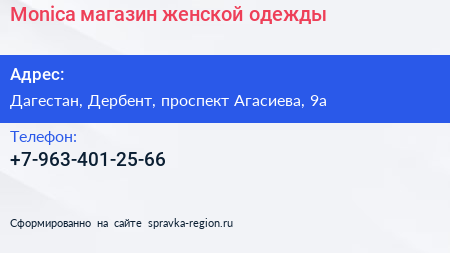 Monica, магазин женской одежды по адресу Дагестан, Дербент, проспект Агасиева, 9а в дальнейшем Организация, размещена в следующих категориях: