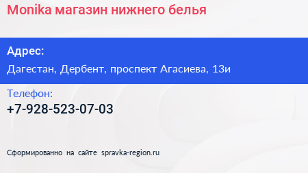 Monika, магазин нижнего белья по адресу Дагестан, Дербент, проспект Агасиева, 13и в дальнейшем Организация, размещена в следующих категориях: