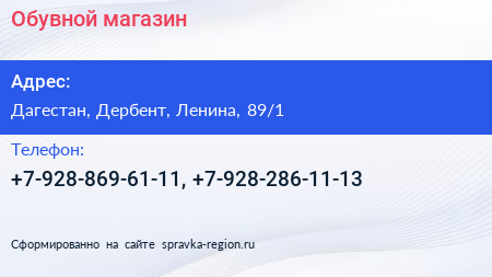 Обувной магазин по адресу Дагестан, Дербент, Ленина, 89/1 в дальнейшем Организация, размещена в следующих категориях: