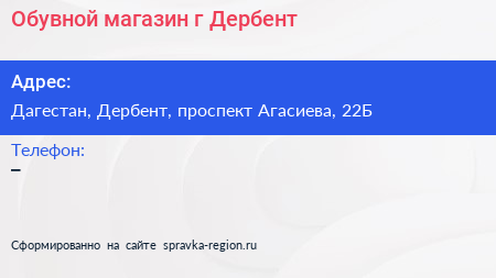 Обувной магазин, г. Дербент по адресу Дагестан, Дербент, проспект Агасиева, 22Б в дальнейшем Организация, размещена в следующих категориях:
