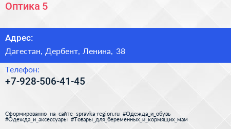 Оптика №5 по адресу Дагестан, Дербент, Ленина, 38 в дальнейшем Организация, размещена в следующих категориях: