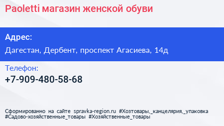 Paoletti, магазин женской обуви по адресу Дагестан, Дербент, проспект Агасиева, 14д в дальнейшем Организация, размещена в следующих категориях: