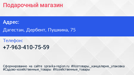 Подарочный магазин по адресу Дагестан, Дербент, Пушкина, 75 в дальнейшем Организация, размещена в следующих категориях:
