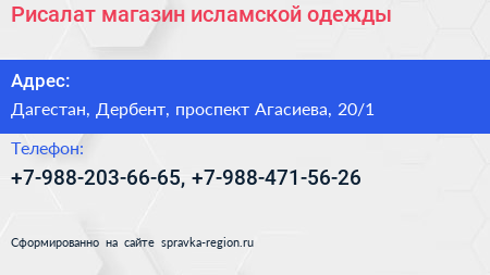 Рисалат, магазин исламской одежды по адресу Дагестан, Дербент, проспект Агасиева, 20/1 в дальнейшем Организация, размещена в следующих категориях: