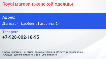 Royal, магазин женской одежды по адресу Дагестан, Дербент, Гагарина, 14 в дальнейшем Организация, размещена в следующих категориях: