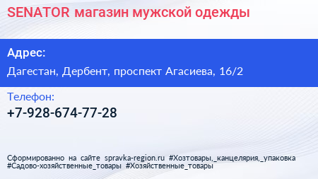 SENATOR, магазин мужской одежды по адресу Дагестан, Дербент, проспект Агасиева, 16/2 в дальнейшем Организация, размещена в следующих категориях: