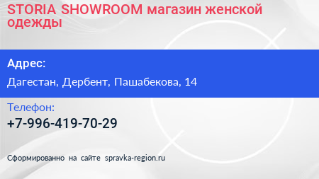 STORIA SHOWROOM, магазин женской одежды по адресу Дагестан, Дербент, Пашабекова, 14 в дальнейшем Организация, размещена в следующих категориях: