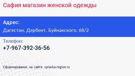 Сафия, магазин женской одежды по адресу Дагестан, Дербент, Буйнакского, 68/2 в дальнейшем Организация, размещена в следующих категориях: