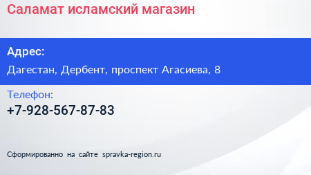Саламат, исламский магазин по адресу Дагестан, Дербент, проспект Агасиева, 8 в дальнейшем Организация, размещена в следующих категориях: