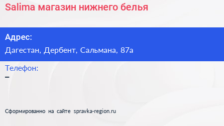 Salima, магазин нижнего белья по адресу Дагестан, Дербент, Сальмана, 87а в дальнейшем Организация, размещена в следующих категориях: