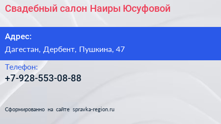 Свадебный салон Наиры Юсуфовой по адресу Дагестан, Дербент, Пушкина, 47 в дальнейшем Организация, размещена в следующих категориях: