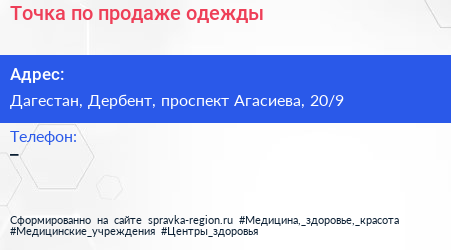 Точка по продаже одежды по адресу Дагестан, Дербент, проспект Агасиева, 20/9 в дальнейшем Организация, размещена в следующих категориях:
