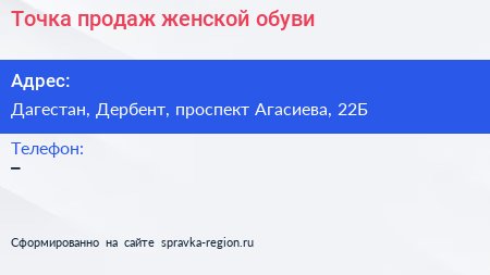 Точка продаж женской обуви по адресу Дагестан, Дербент, проспект Агасиева, 22Б в дальнейшем Организация, размещена в следующих категориях: