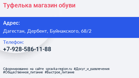 Туфелька, магазин обуви по адресу Дагестан, Дербент, Буйнакского, 68/2 в дальнейшем Организация, размещена в следующих категориях: