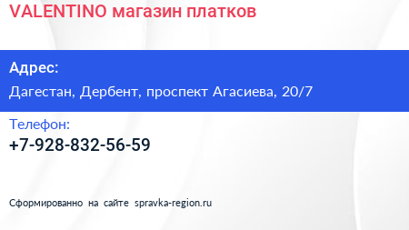 VALENTINO, магазин платков по адресу Дагестан, Дербент, проспект Агасиева, 20/7 в дальнейшем Организация, размещена в следующих категориях: