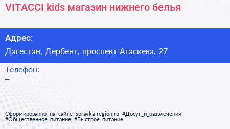 VITACCI kids, магазин нижнего белья по адресу Дагестан, Дербент, проспект Агасиева, 27 в дальнейшем Организация, размещена в следующих категориях:
