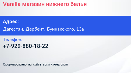 Vanilla, магазин нижнего белья по адресу Дагестан, Дербент, Буйнакского, 13а в дальнейшем Организация, размещена в следующих категориях: