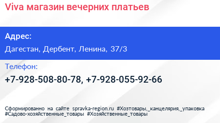 Viva, магазин вечерних платьев по адресу Дагестан, Дербент, Ленина, 37/3 в дальнейшем Организация, размещена в следующих категориях: