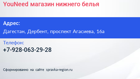 YouNeed, магазин нижнего белья по адресу Дагестан, Дербент, проспект Агасиева, 16а в дальнейшем Организация, размещена в следующих категориях:
