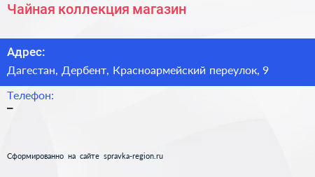 Чайная коллекция, магазин по адресу Дагестан, Дербент, Красноармейский переулок, 9 в дальнейшем Организация, размещена в следующих категориях: