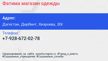 Фатима, магазин одежды по адресу Дагестан, Дербент, Хизроева, 20г в дальнейшем Организация, размещена в следующих категориях: