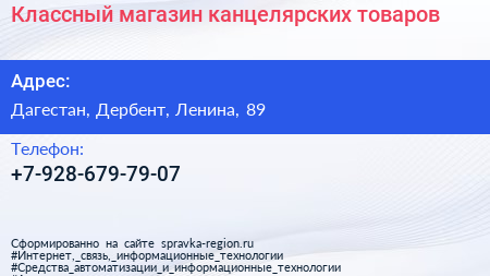 Классный, магазин канцелярских товаров по адресу Дагестан, Дербент, Ленина, 89 в дальнейшем Организация, размещена в следующих категориях: