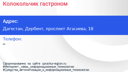 Колокольчик, гастроном по адресу Дагестан, Дербент, проспект Агасиева, 18 в дальнейшем Организация, размещена в следующих категориях:
