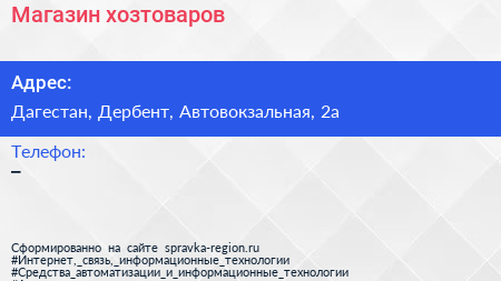 Магазин хозтоваров по адресу Дагестан, Дербент, Автовокзальная, 2а в дальнейшем Организация, размещена в следующих категориях: