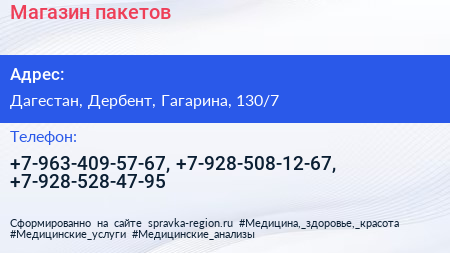 Магазин пакетов по адресу Дагестан, Дербент, Гагарина, 130/7 в дальнейшем Организация, размещена в следующих категориях: