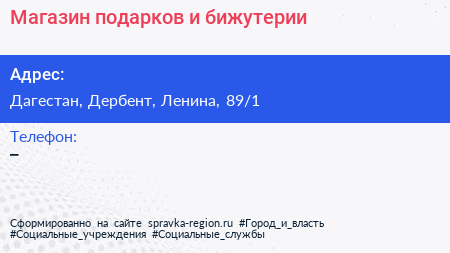 Магазин подарков и бижутерии по адресу Дагестан, Дербент, Ленина, 89/1 в дальнейшем Организация, размещена в следующих категориях: