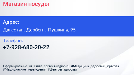 Магазин посуды по адресу Дагестан, Дербент, Пушкина, 95 в дальнейшем Организация, размещена в следующих категориях: