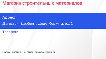 Магазин строительных материалов по адресу Дагестан, Дербент, Деде Коркута, 61/1 в дальнейшем Организация, размещена в следующих категориях: