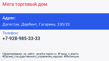 Мега, торговый дом по адресу Дагестан, Дербент, Гагарина, 130/22 в дальнейшем Организация, размещена в следующих категориях: